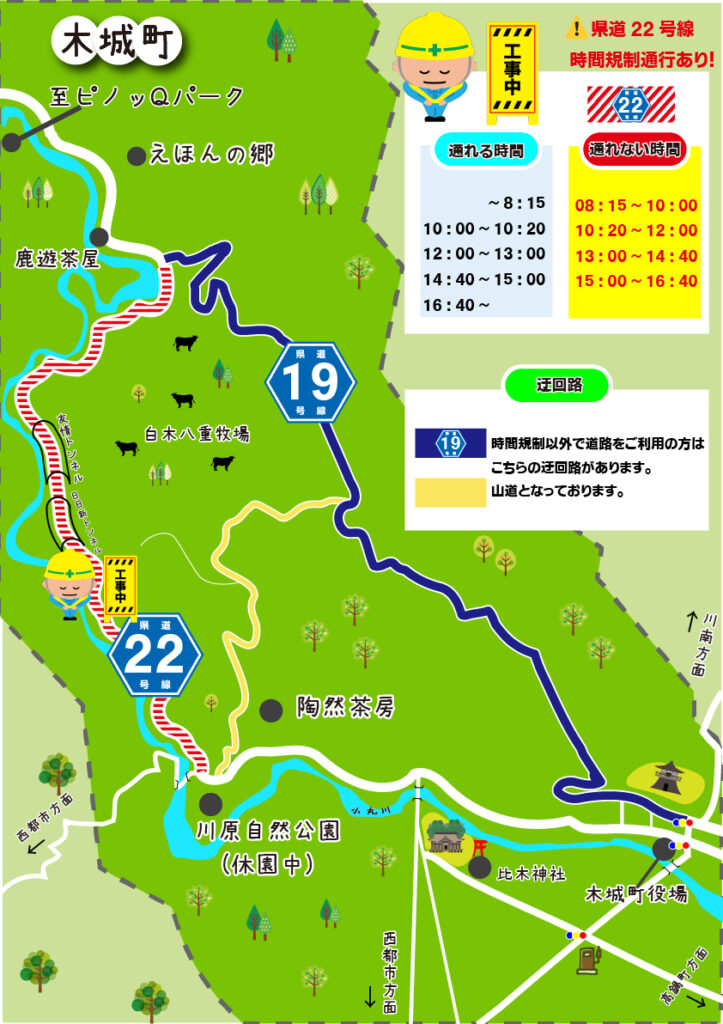 県道22号線の災害復旧工事のため、道路通行が時間規制となります。通行できる時間以外に通行する場合は、県道19号線に迂回する必要があります。(案内図参照)